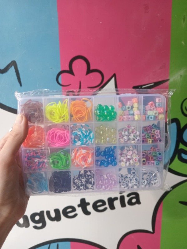 • Incluye: 8 casilleros con cuentitas de colores, 16 diseños distintos de gomitas bolsa con ganchitos.
