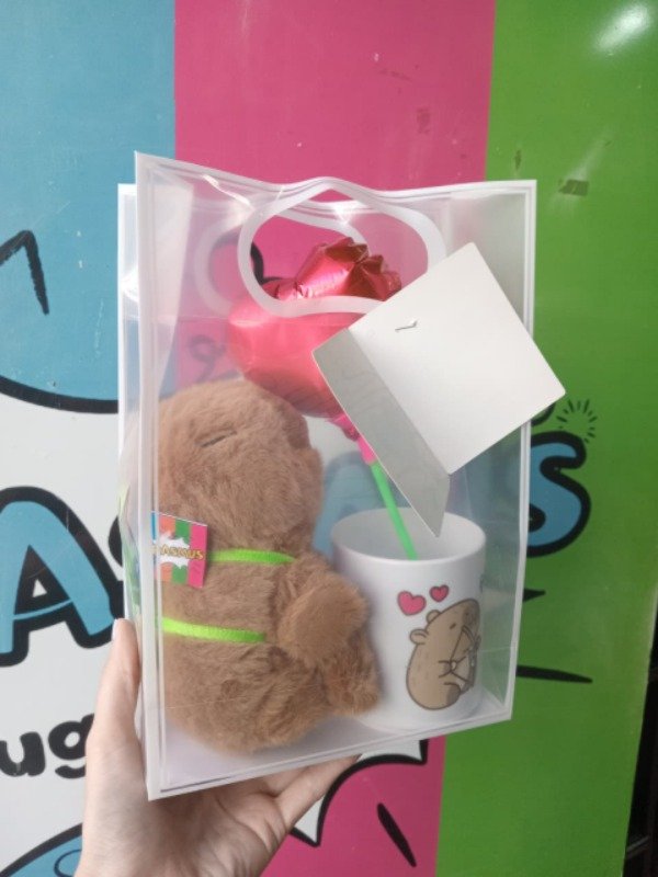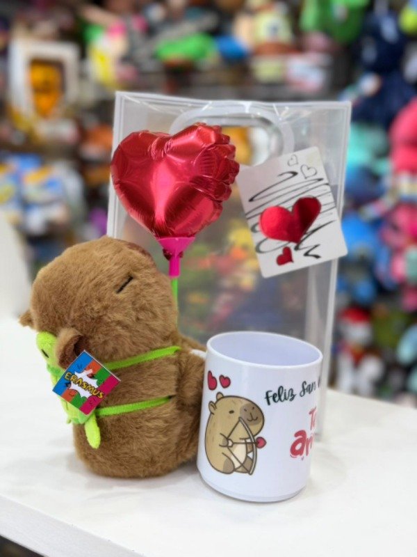 Incluye: taza de plástico Capibara San valentín, peluche pulsera de Capibara con mochila para trasladar el amor a todos lados🥰, globito, tarjeta y bolsa.