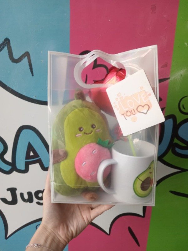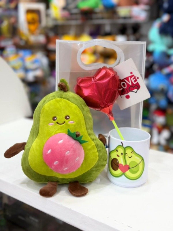 • Incluye: Peluche de Palta mediano, taza de Palta plástico, lapicera corazón con te amo, globo, tarjeta y bolsa transparente decorada.