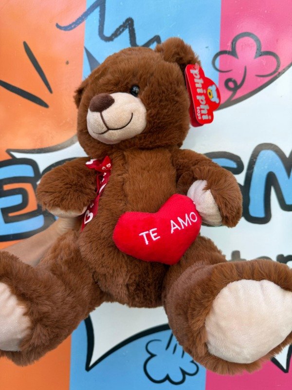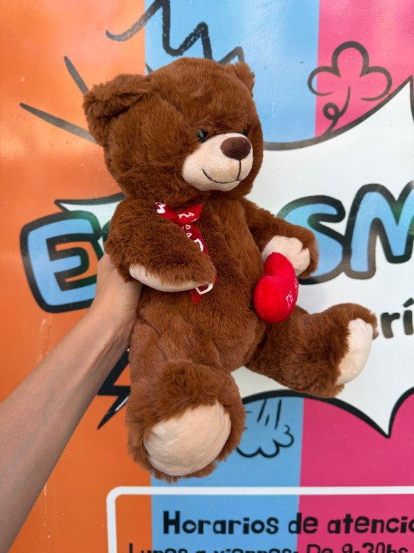 Osito de peluche de tela suave y peludita. Tiene un corazón pequeño en la mano con la frase "te amo" bordada; y un moño coqueto, con estampas de corazones en su cuello.