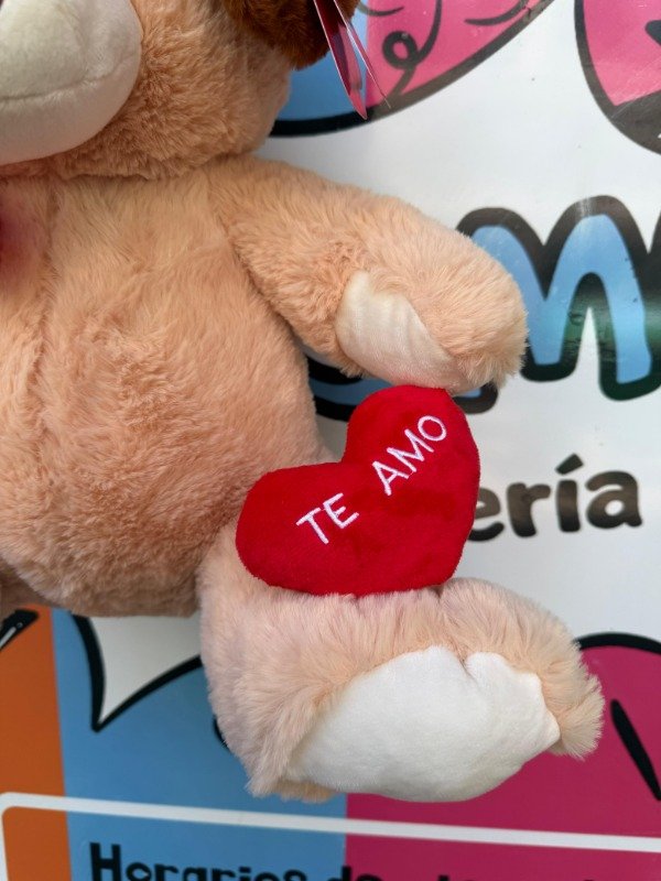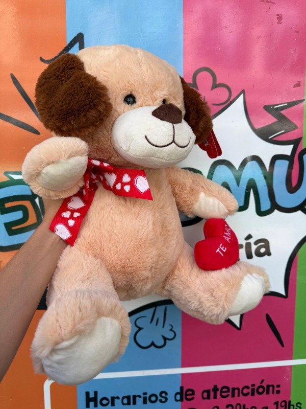 Perrito de peluche de tela suave y peludita con dos moñitos de tela estampados con corazones. Tiene en una manito un corazón de peluche que dice "te amo" bordado. 😍