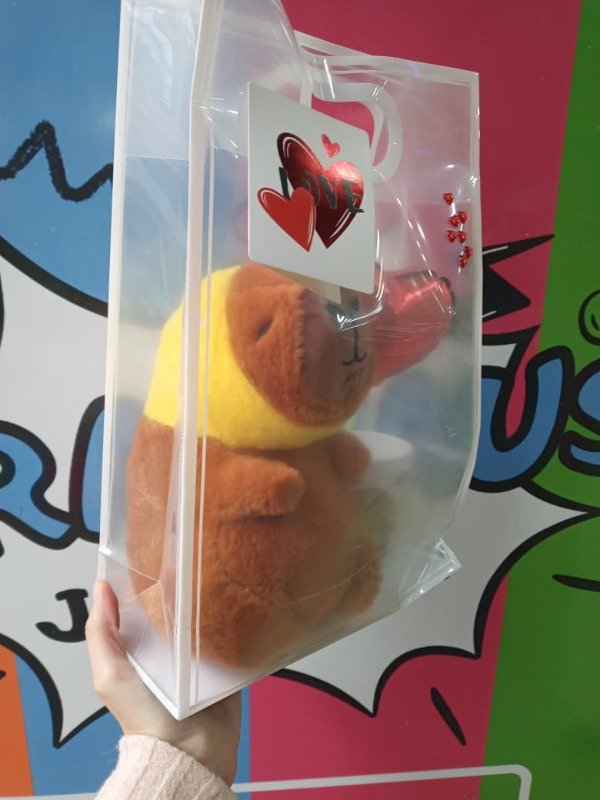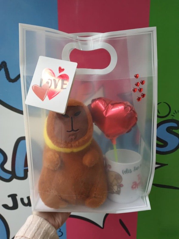 • Incluye: taza de plástico Capibara San valentín, peluche de Capibara con gorrito, globito, tarjeta y bolsa.